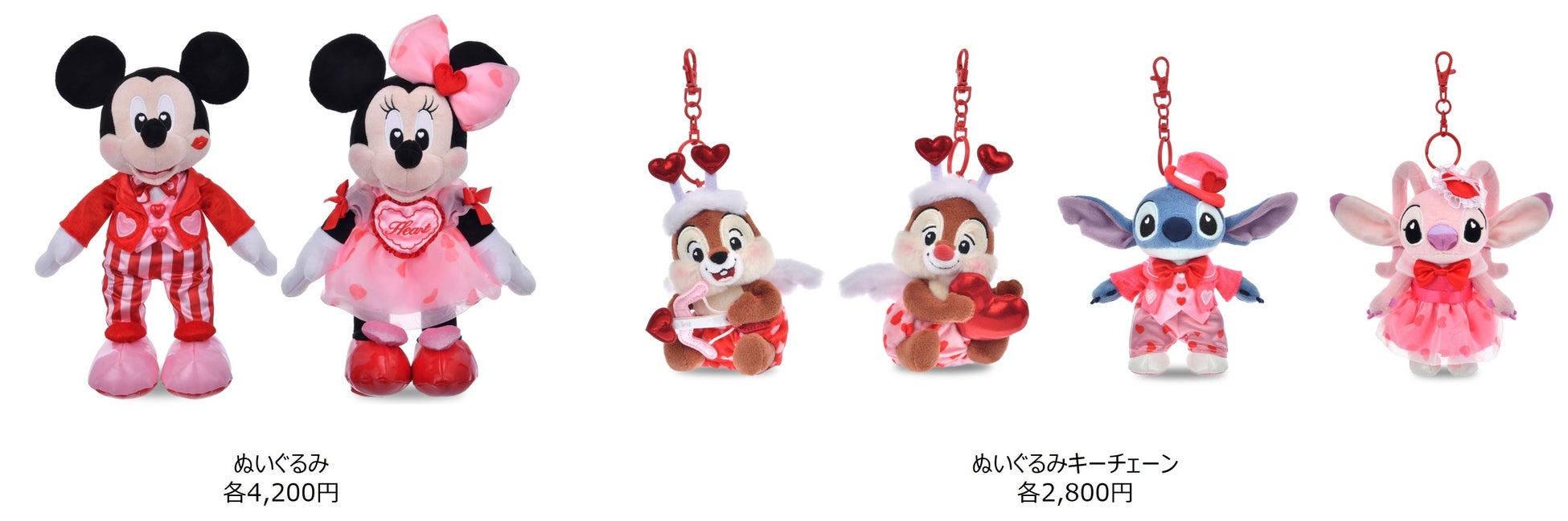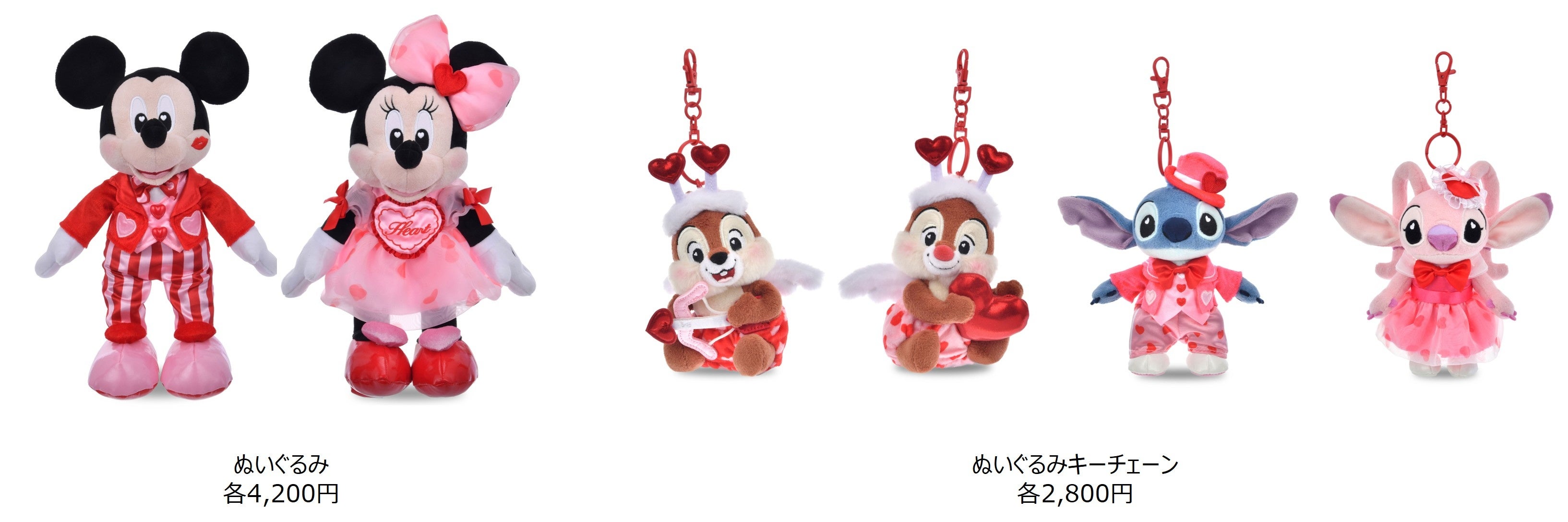 ハート尽くしのキュートなぬいぐるみシリーズが登場。ミッキーマウス、ミニーマウス、チップ、デール、スティッチ、エンジェルのぬいぐるみとぬいぐるみキーチェーンを展開します。