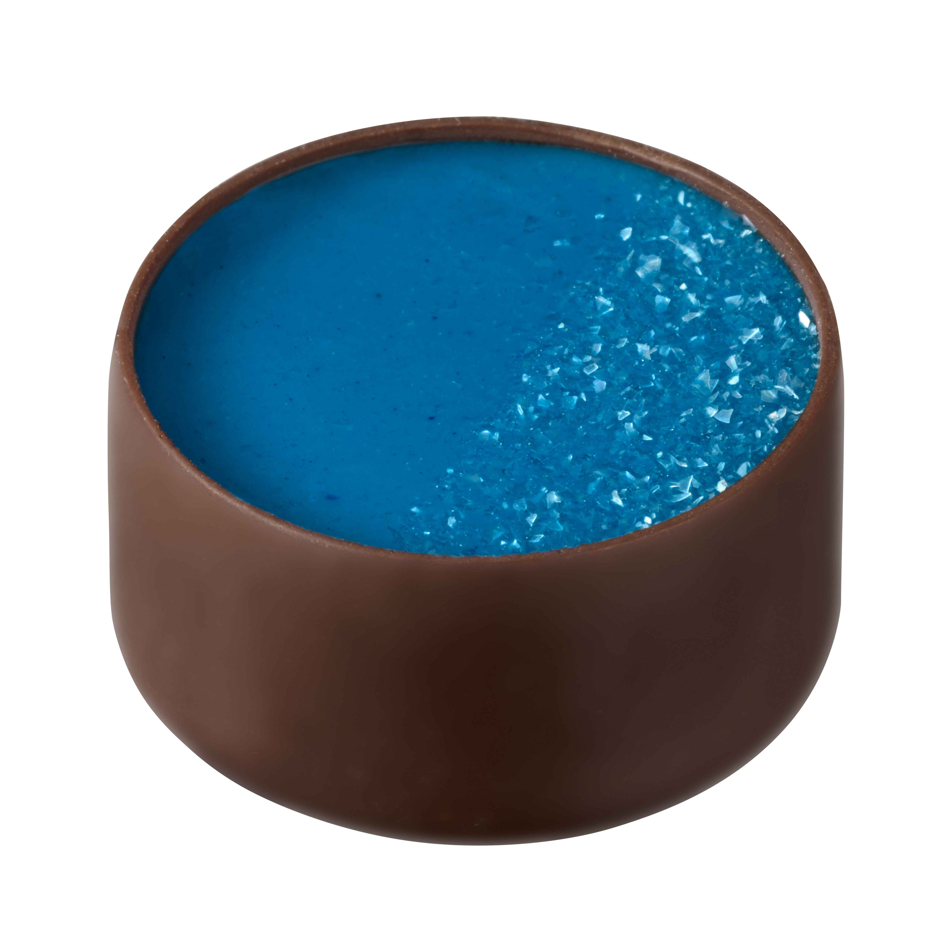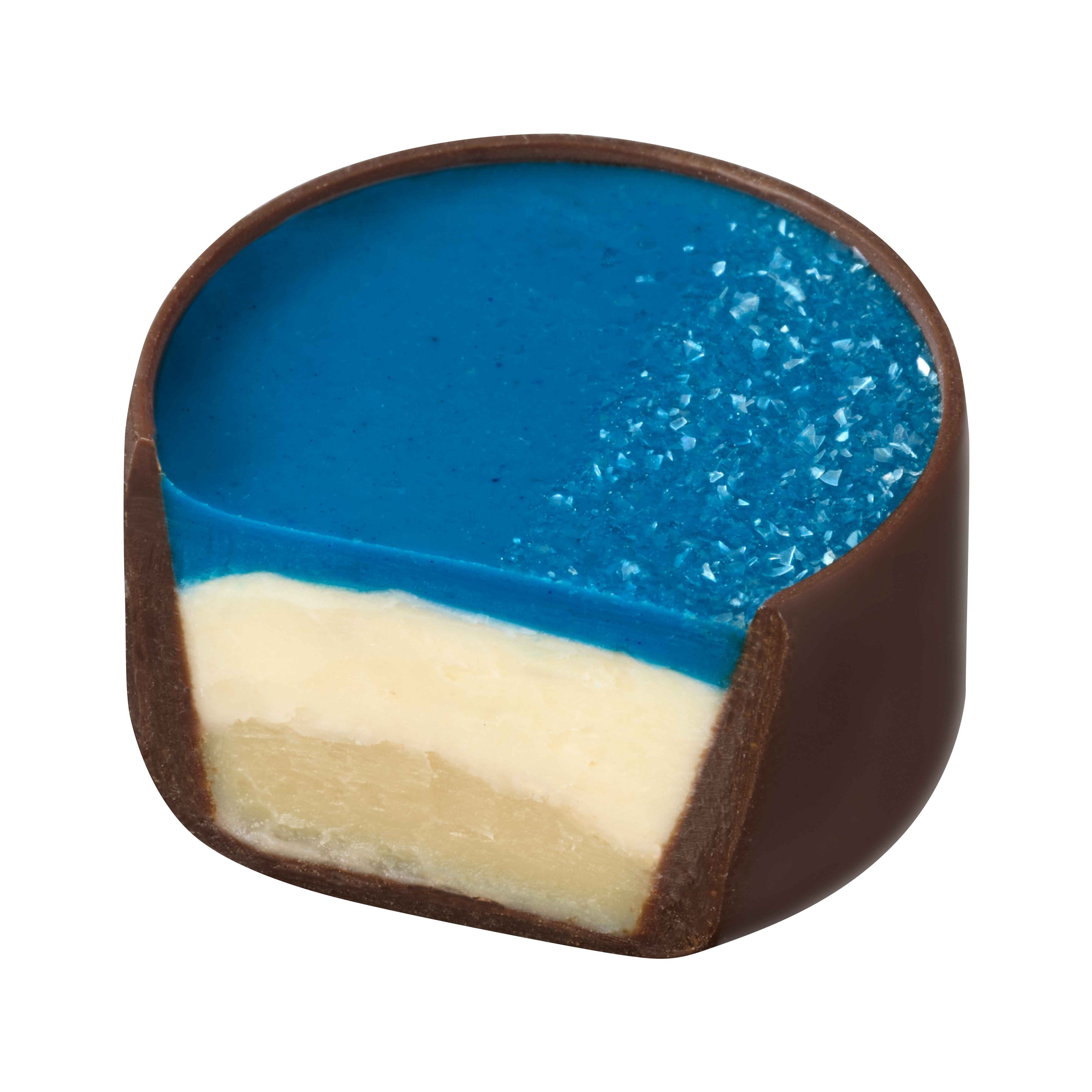 レモンガナッシュとレモンムースをダークチョコレートのカップで包み、夜空のようなチョコレートとグリッターでデコレーション。夜空に輝くピクシーダストをイメージしたひと粒。