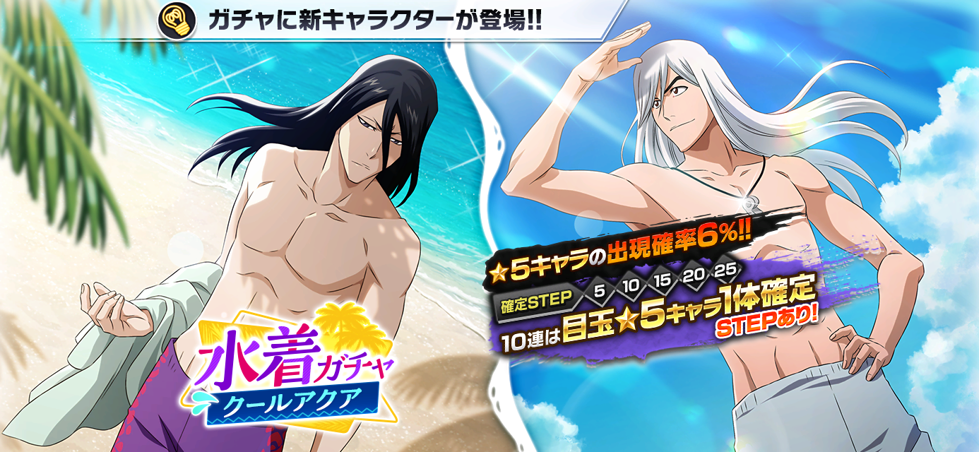 8月16日(水)より、朽木白哉 (水着2023ver.)と浮竹十四郎 (水着2023ver.)が登場するガチャを開催しております。