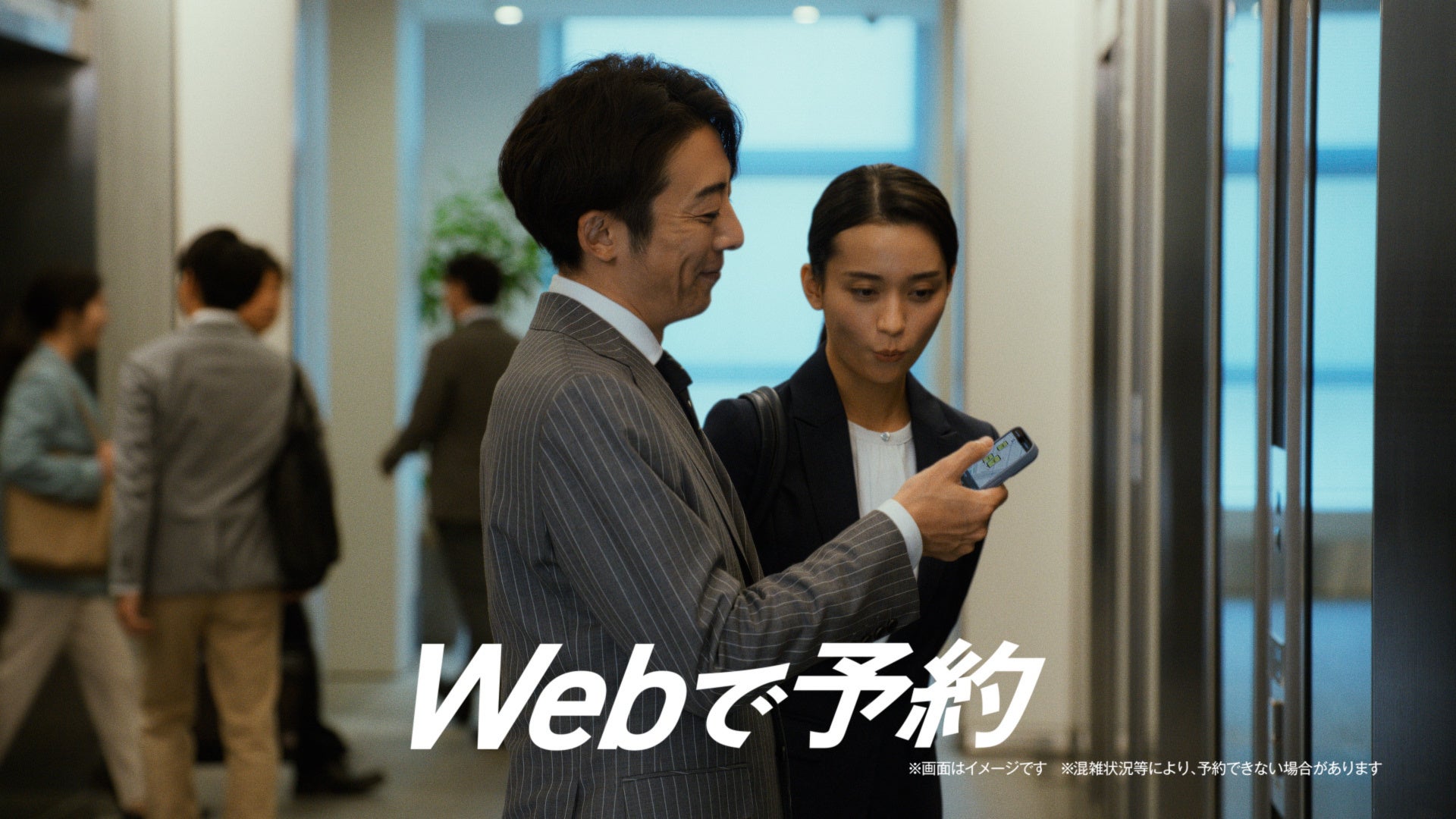 営業に出るためデスクで準備をしている高橋一生さんに、後輩から“営業車が空いていない”と、思いもよらない報告を受けます。一瞬困惑するも、心配無用と言わんばかりの顔で「そんなときは タイムズカー!」と、すぐに代替となる移動手段を示します。オフィスから移動時、エレベーターの待ち時間にタイムズカーをWebで予約し、営業車の空きがないという窮地をスマートに脱します。 タイムズカーの手続きの手軽さを誇らしげに語る先輩社員を、高橋一生さんがコミカルに演じます。
