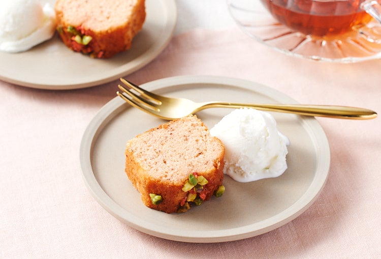 水分は苺シロップのみを使用。何度も試作を繰り返し、バランスの取れたおいしいパウンドケーキに仕上げました。冷やすことでよりしっとりとした食感になります。