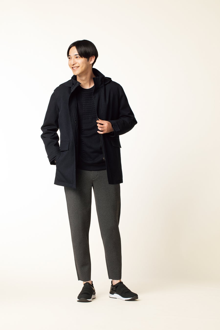 ①ウール調できちんと感を演出し、シルエットでリラックス感を表現