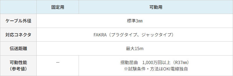 OKI電線は、高精度なケーブル製造技術とロボットケーブルで培った可動耐久性に優れた設計技術を組み合わせ、高速伝送性能を維持しながら、カメラの動きに追従する可動耐久性と狭小箇所への実装も可能な細径ケーブルを開発しました。本ケーブルは、小型で発熱量が少ない特長の車載用高速伝送LVDS規格(注3)に対応しています。また、車載用GPSやカメラに用いられ、耐振動性に優れた高信頼性接続を実現するFAKRAコネクタを採用することで、高速伝送と摺動(注4)性能に優れています。