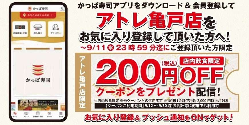 公式アプリ(https://www.kappasushi.jp/app.html) をダウンロード&会員登録いただき、8月26日(月)から9月11日(水)23時59分までに『アトレ亀戸店』をお気に入り登録いただくと9月12日(木)から9月30日(月)まで、お会計毎に何度でもご利用いただける“店内飲食限定200円(税込)OFFクーポン”をプレゼント配信いたします。