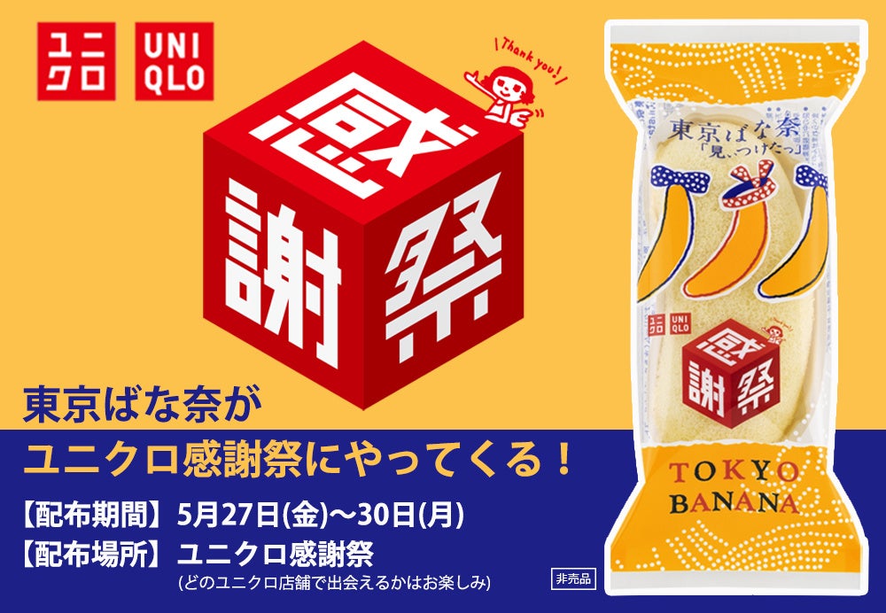 「ユニクロ感謝祭」に『東京ばな奈』が再び参加決定~!5月27日(金)~30日(月)の4日間限定で開催される特別企画「全国銘菓祭」企画にて、ユニクロ店舗にご来店のお客様に「東京ばな奈」が1個プレゼントされる事となりました。どのユニクロ店舗で出会えるかはお楽しみ。「東京ばな奈は初めまして」な方も、「東京ばな奈が大好き」な方も、ぜひこの機会にユニクロで「夏のファッション」と「東京ばな奈」をゲットして!
