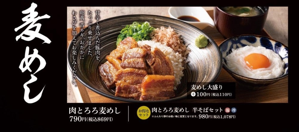 食べ応えのある4枚の大判牛すき肉に千切りとろろを絡めて、豪快に頬張れば口いっぱいに肉の旨みと特製割下の甘味が広がります。プラス110円(税込)で「追い麦めしセット」にすれば、そばも麦めしも一度に味わえます。