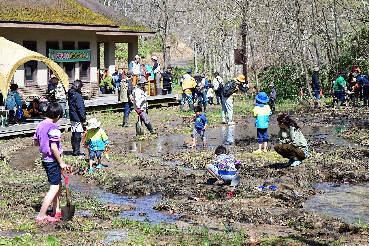 滝野の森のプレーパーク!担当のボランティアが安全を見守る中で水辺や森で生きものを探したり、