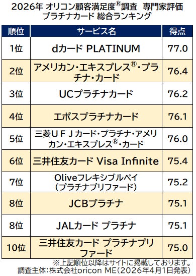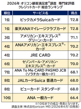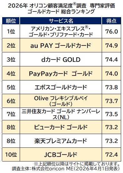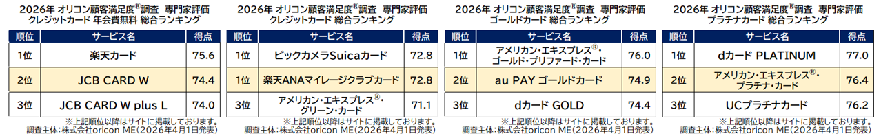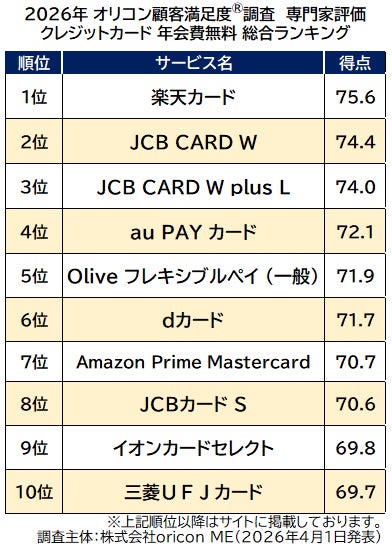 オリコン株式会社(本社:東京都港区 代表取締役社長:小池 恒、略称:オリコン)は、グループ会社である株式会社oricon MEが、金融系の専門家を対象に実施した『クレジットカード 年会費無料/クレジットカード/ゴールドカード/プラチナカード』の専門家評価の調査結果を、2026年4月1日(水)14時に「オリコン顧客満足度®」公式サイト内にて発表いたしました。ランキングの結果は、下記の通りとなりました。