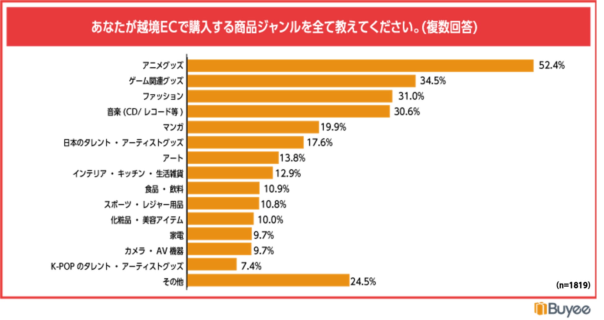 ✓越境ECで購入する商品ジャンルは「アニメ」52.4%、「ゲーム」34.5%、「ファッション」31.0%