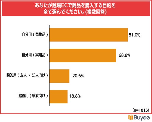 また、越境ECで商品を購入する目的について質問したところ、「自分向けのコレクション用途」81.0%、「自分向けの実用品」68.6%となりました。「贈答用途」は友人・知人向けで20.6%、家族向けで18.8%となり、越境EC利用者の主な購入目的は「自分向け」であることがわかりました。