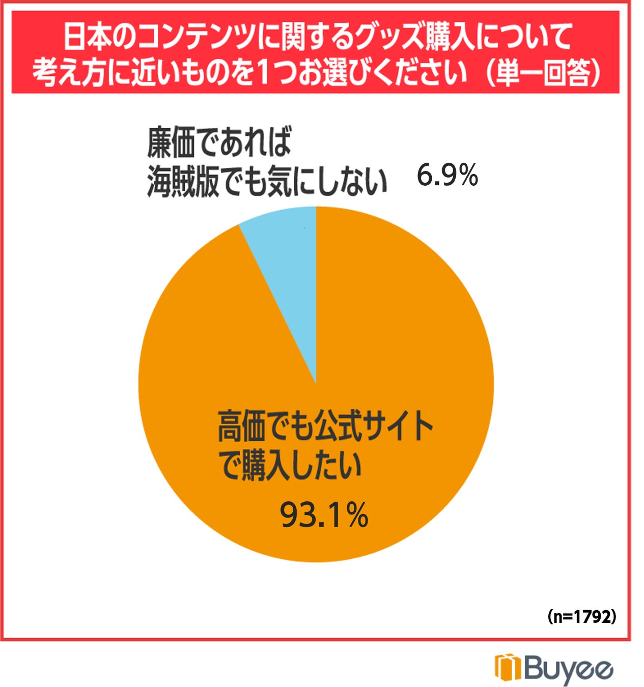 人気の高い日本コンテンツのグッズ購入の考え方について質問したところ、「高価でも公式サイトで購入したい」が93.1%と大半を占め、公式商品に対しての高い購入意向が伺えました。