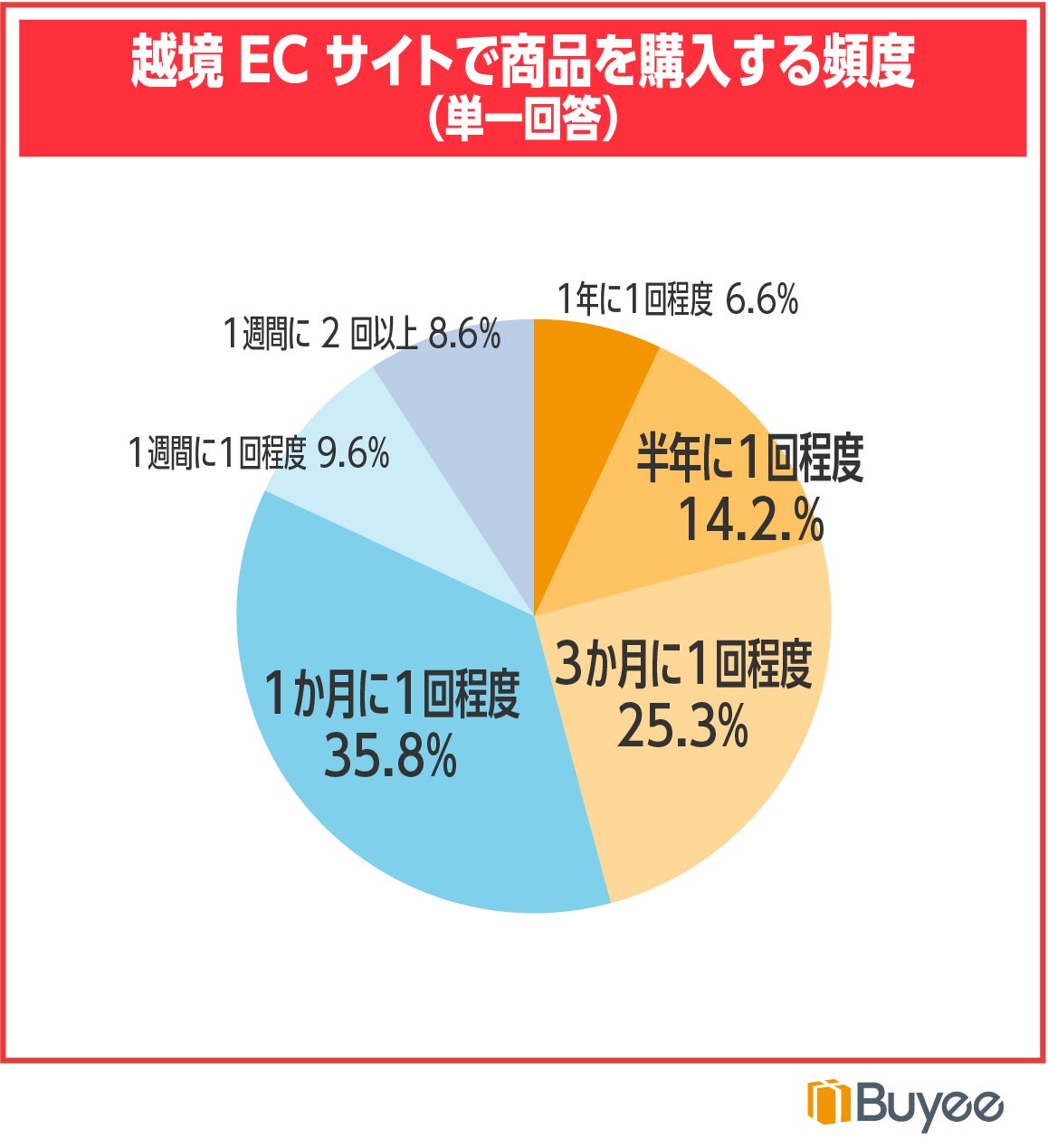 越境ECサイトでの商品購入頻度を質問したところ、「1か月に1回程度」が最も多く35.8%となりました。「1週間に1回程度」9.6%と「1週間に2回以上」8.6%という回答を含めた54.0%が月に1回以上越境ECを利用しており、回答者にとって越境ECでのお買い物は日常的なものであることが見て取れます。