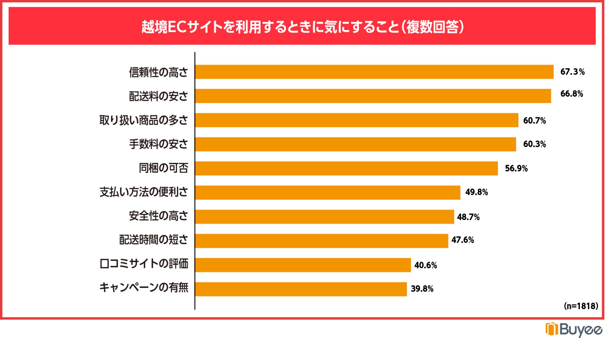 越境ECサイトを利用する際に気にすることについて質問をしたところ、「信頼性の高さ」が最も高く67.3%となり、越境EC利用者は、信頼できる商品かどうかを重視していることが分かります。