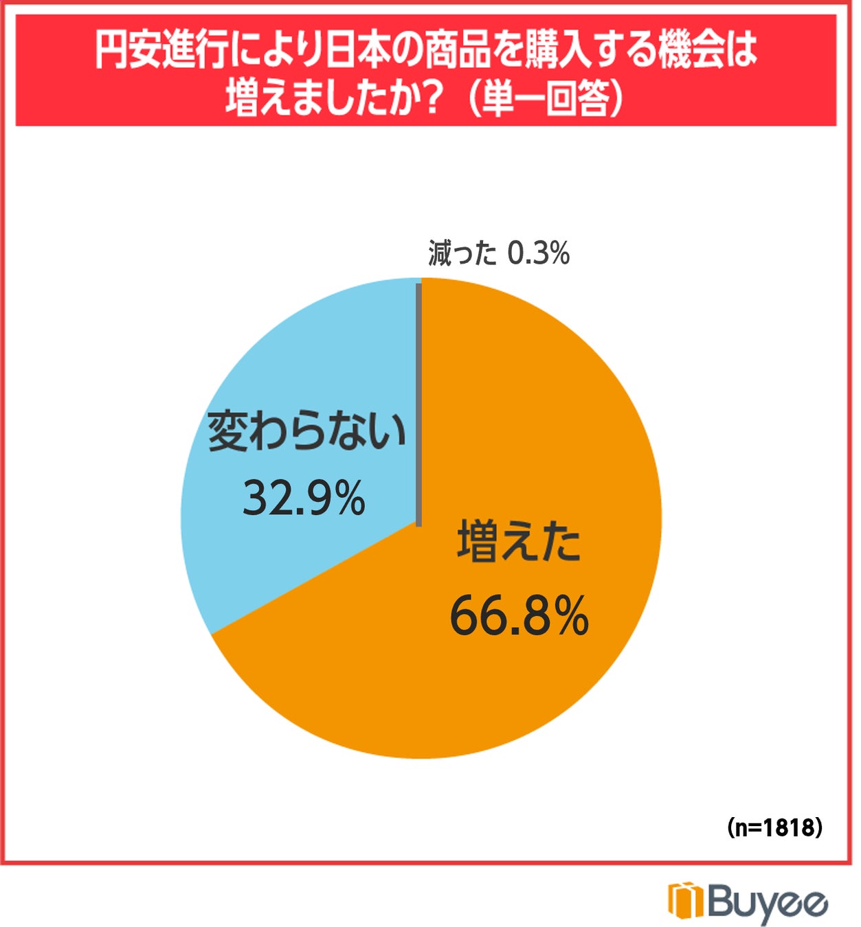 越境ECで商品購入を行う際に相手国の為替相場の動きを確認するか質問したところ、71.0%が「はい」と回答しています。また、円安の進行により日本の商品を購入する機会が増えたかという質問に対しては66.8%、が「増えた」と回答しており、次いで、「変わらない」32.9%、「減った」0.3%という結果になりました。越境ECの利用時に為替相場を確認する海外の消費者にとって、2022年以降進んだ円安は購入意欲を高めるきっかけとなっていることがわかりました。