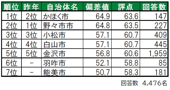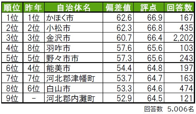 ○トップ3は昨年と同じ顔ぶれ、1位はかほく市