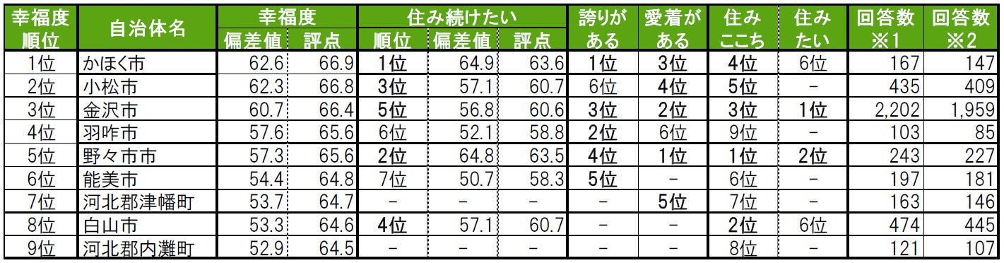 1位はかほく市で、「街の幸福度」「街に誇りがある」でも1位、「街に愛着がある」3位、「住みここち」4位と各ランキングで評価の高い街です。2位は野々市市で、「住みここち」「街に愛着がある」1位、「住みたい街」2位、「街に誇りがある」4位、「街の幸福度」5位と、全ランキングでトップ5入りしています。3位は2年連続で小松市で、「街の幸福度」2位、「街に愛着がある」4位、「住みここち」5位となっています。
