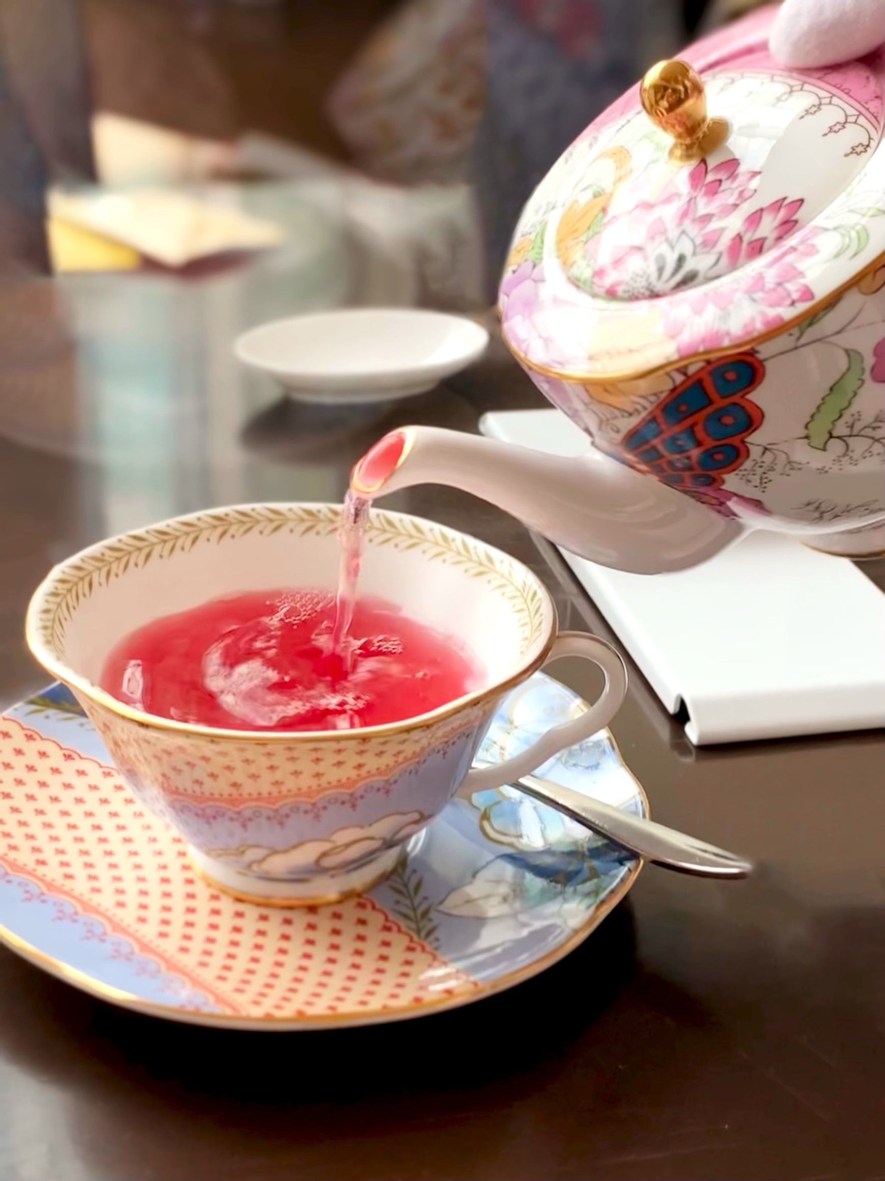 春の訪れを感じさせるウェッジウッド「バタフライ・ブルーム」シリーズのティーセットで提供するAFTERNOON TEA with “SIROCCO”。