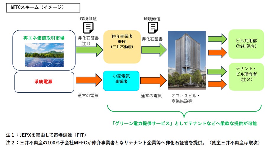 今般、三大都市圏以外のエリアについて、当社グループでは三井不動産ファシリティーズ株式会社(以下「MFFC」)を仲介者とした新たなグリーン電力提供スキーム(以下「MFFCスキーム」)を開発。2025年4月より、小売電気事業者との包括協定とMFFCスキームを組み合わせ、全国のテナント企業・グループ会社へのグリーン電力提供を実現します。