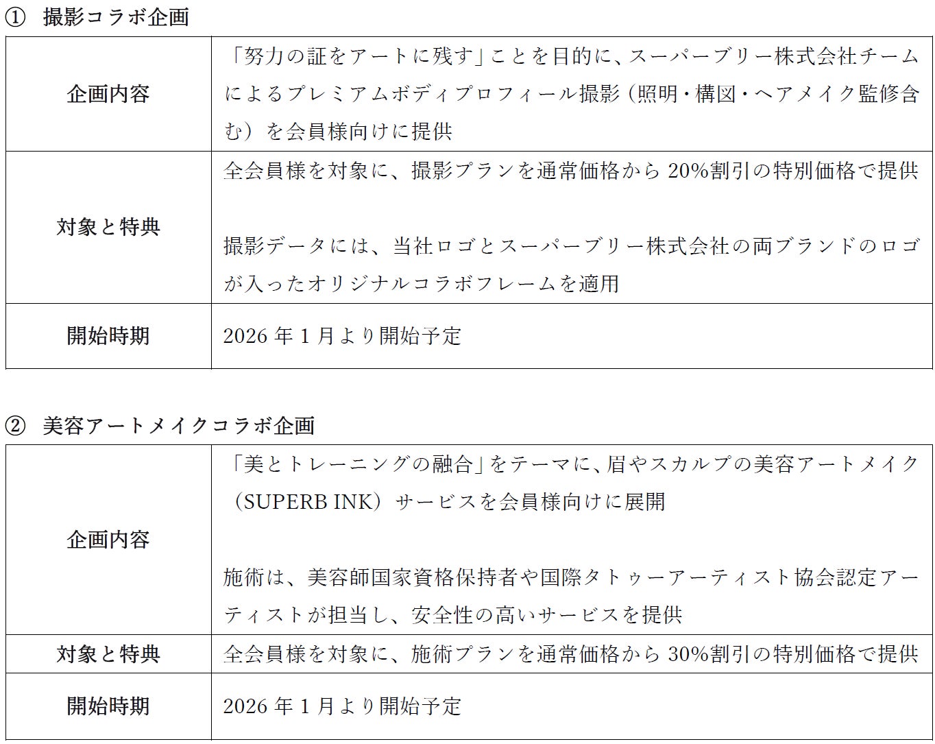 今回のコラボレーションでは、トレーニングを通じて得られた「努力の証をアートに残す」という、フィットネスの新しい価値を追求します。スーパーブリー株式会社が持つ高い撮影技術と、プロフェッショナルな美容アートメイク(SUPERB INK)サービスを融合させることで、「トレーニング後も続く美の提供」を実現し、「手間をかけずに常に美しくありたい」という美容志向層のニーズに応えます。