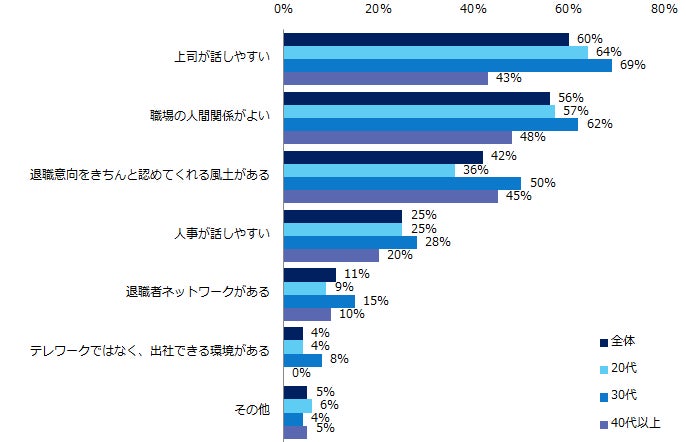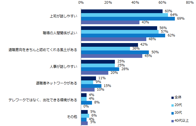退職代行サービスを利用したことがある方に「どのような環境や条件があれば、退職代行を利用しなかったと思いますか?」と伺うと、第1位は「上司が話しやすい」(60%)、次いで「職場の人間関係がよい」(56%)、「退職意向をきちんと認めてくれる風土がある」(42%)が続きました。