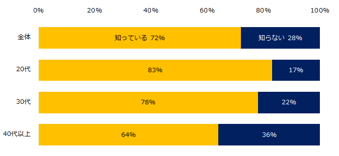 「退職代行」とは、労働者本人に代わって、代行業者や弁護士が会社に退職の意思を伝えるサービスです。「退職代行というサービスを知っていますか?」と伺うと、72%が「知っている」と回答しました。年代別でみると、40代以上の認知度が64%に対し、20代は83%と、19ポイントの差がありました。