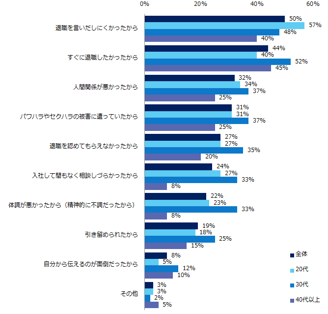 ・人間関係が悪かったのと、仕事の内容が合わなくて辞めたかった。退職したい意思を認めてもらえないような気がしたので、退職代行を使った。(24歳男性)