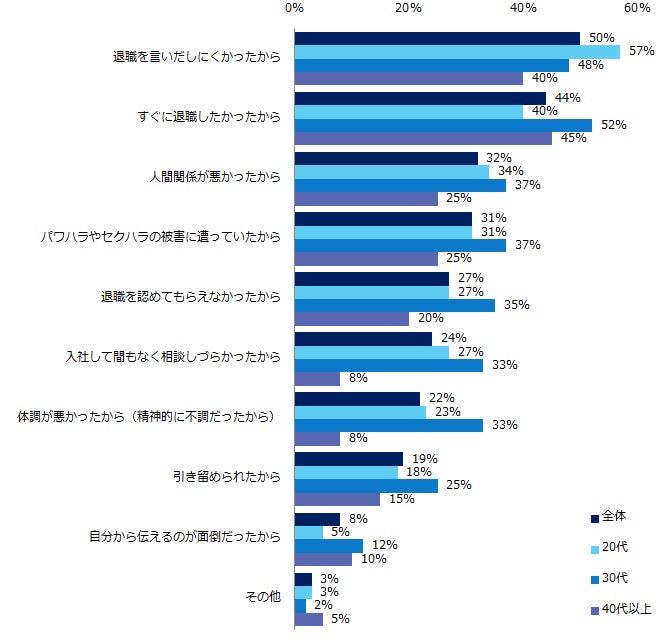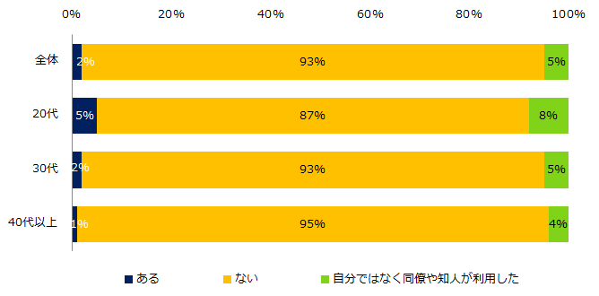 「退職代行サービスを利用したことがありますか?」と伺うと、93%が「ない」と回答。利用経験のない方に理由を伺うと「退職意向は自分で会社に言うべきだと思うから」(44%)が最多でした。一方で、「ある」は全体の2%。利用の理由トップは「退職を言い出しにくかったから」(50%)で、特に20代の回答が目立ちました。30代、40代のトップは「すぐに退職したかったから」(30代:52%、40代以上:45%)でした。実際に利用した方、同僚や知人が利用した方のエピソードも紹介します。