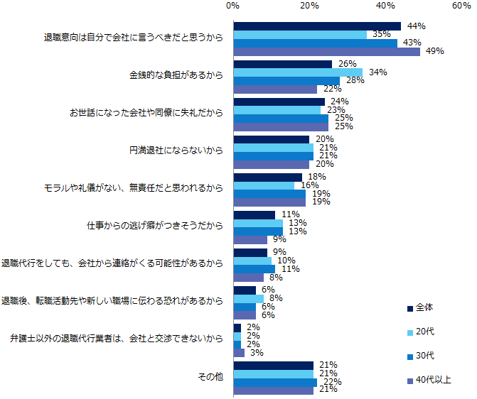 ・何度も退職希望について伝えたが辞めさせてもらえず、やむを得ず代行を使った。(32歳女性)