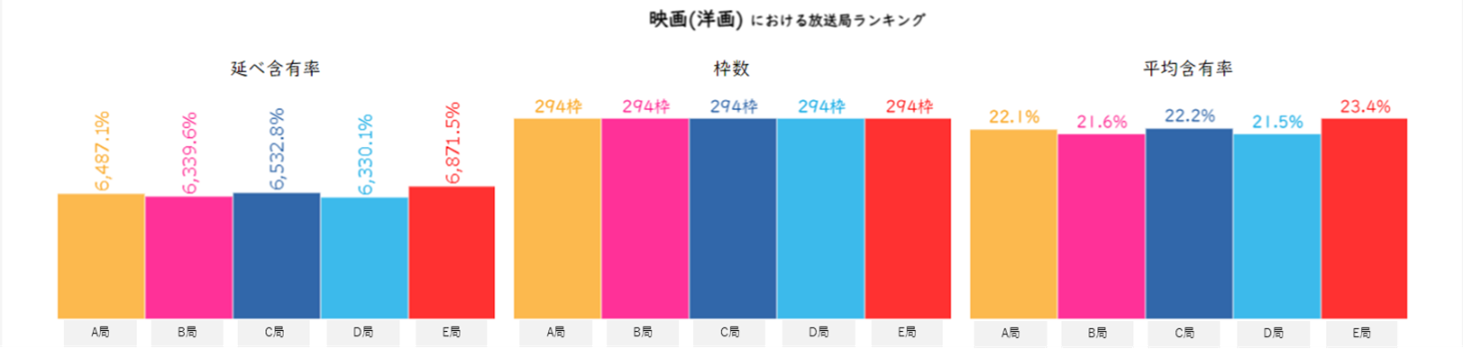 (1)E局は、映画(洋画)興味関心層の延べおよび平均含有率、枠数全てにおいてNo.1(6:00~23:59、全日ゾーン、1~5位枠内)のため、出稿に最適です。