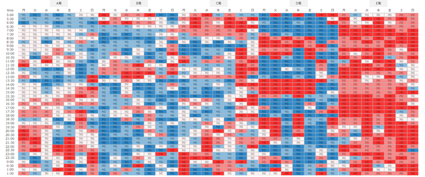3.一覧性のあるUI: 放送エリア内のTV局比較がヒートマップで比較可能
