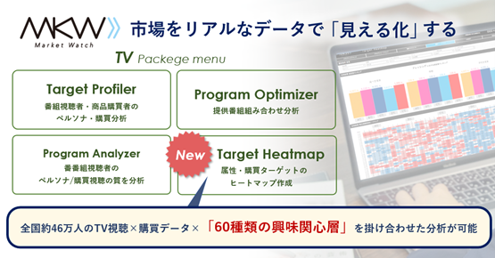 CCCマーケティング株式会社(本社:東京都渋谷区、代表取締役社長:北村和彦)は、2021年10月より、全国のTV局や広告会社、広告主のみなさまに向けて、TVCM出稿分析ツール「Market Watch Target Heatmap」(以下「MKW TH」)を提供しています。このたび、2022年1月31日より、「MKW TH」のセグメント対象に、書籍・映像・雑誌・雑貨などの購買データから導き出したエンタメ・教育・料理・旅行など約60種類の興味関心層を、「興味関心セグメント」として追加いたしましたことをお知らせいたします。