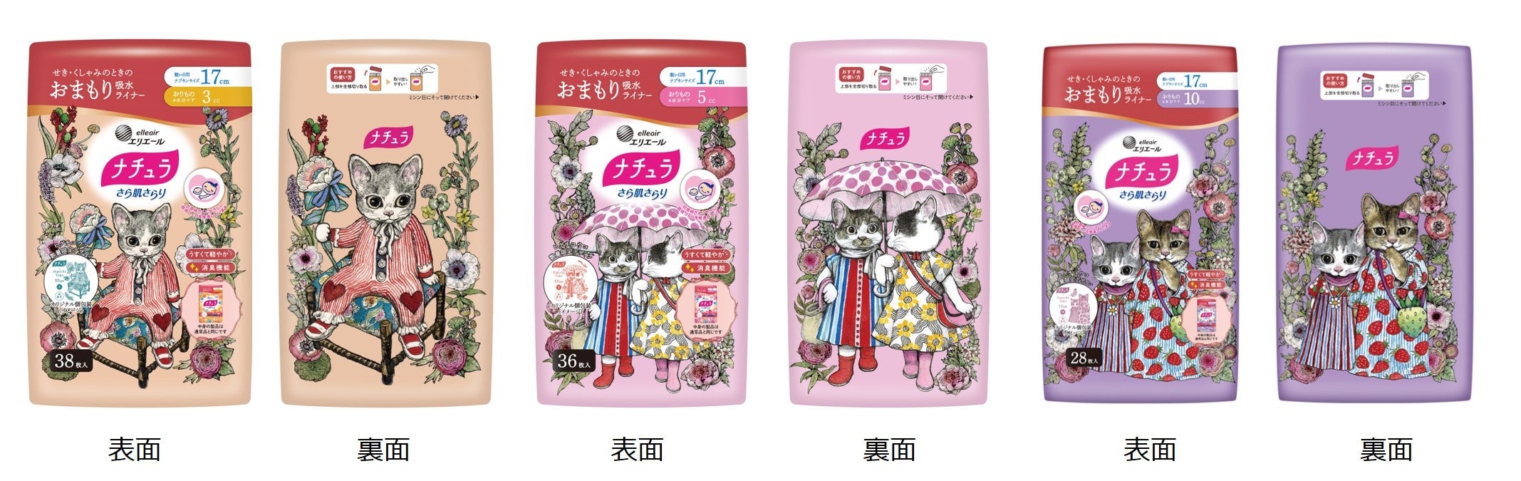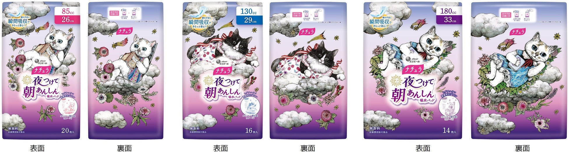 第3弾の「ナチュラ ヒグチユウコ コラボデザイン」では、症状に応じて選べる、せき・くしゃみ時の「おまもり吸水ライナー」と、もしもの不安にも安心な「あんしん吸水ナプキン」、朝の尿モレ対策のために就寝前に使用し “眠る前の新習慣”を提案する「夜つけて朝あんしん 吸水パッド」から全12商品を発売。さまざまな「ナチュラ」シリーズからコラボデザインをお楽しみいただけます。ヒグチユウコさんが描く繊細で美しい12種類のネコのデザインを外装・個包装に採用。華やかなデザインが手に取る瞬間から気持ちを前向きにします。裏面には商品情報を減らして正面よりも大胆にイラストをあしらい、周囲の目を気にせずに保管ができるようなパッケージに仕上げました。