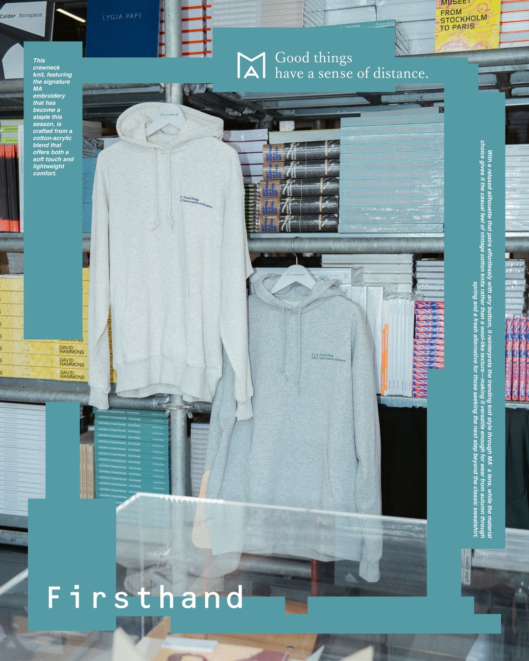 「Good things have a sense of distance. =いいモノには距離感が必要」をコンセプトに、ユニセックスカシミヤブランド「BODHI」のデザイナー・水谷 倫(みずたに さとし)氏を監修に迎えるMA Firsthand。キーフレーズである「Good things have a sense of distance. 」は、新しいものと古いもの、伝統と最先端、男性と女性など世の中に対比される物事のなかで、お互いの良さを認め合うちょうどいい距離=「間」を知るというコンセプトを表現。