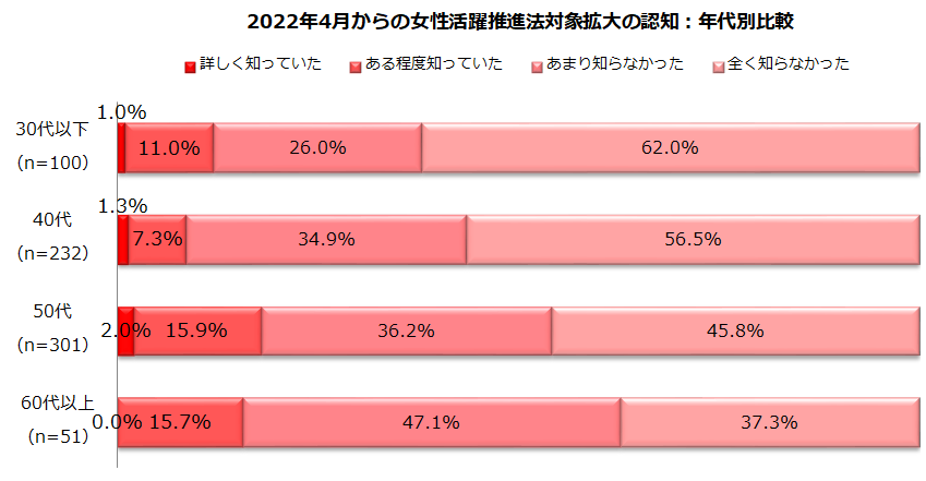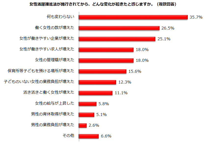 女性活躍推進法でどんな変化が起きた?「変わらない」35.7%、「働く女性の数が増えた」26.5%/2022年4月からの対象拡大を「知らなかった」86.3%