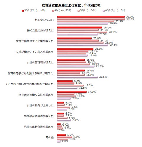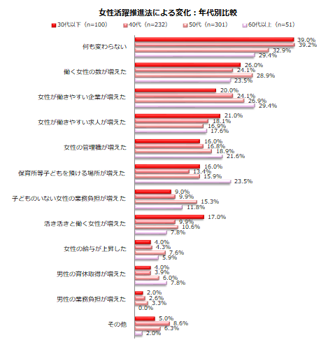 また、「女性活躍推進法が施行されてから、どんな変化が起きたと感じますか」との質問に対しては、「何も変わらない」と回答した人が最も多く35.7%、次いで「働く女性の数が増えた」26.5%、「女性が働きやすい企業が増えた」25.1%と続きました。年代別で比較すると30代以下と40代では、「何も変わらない」と回答した人が4割近くなっており、低い年代の方が法制定の効果を実感できていない傾向があるようです。年代が低いほど法律の対象拡大について認知が少なかったことから、低年代層は他の年代と比べて女性活躍推進法への関心も効果の実感も薄いようです。