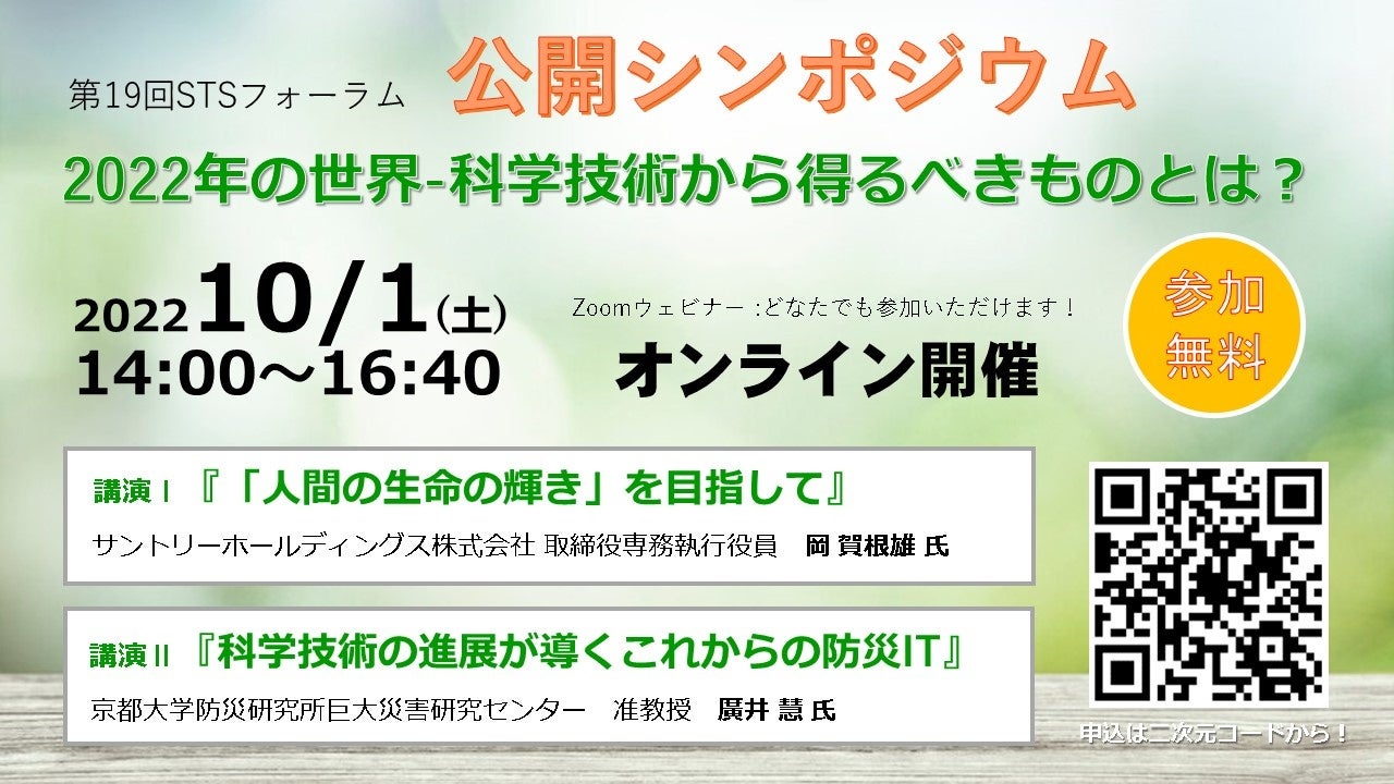 ■京都府などで構成するSTSフォーラム支援京都実行委員会では、第19回「科学技術と人類の未来に関する国際フォーラム(STSフォーラム)」の開催にあわせ、公開シンポジウムを10月1日(土)にオンラインで実施します。