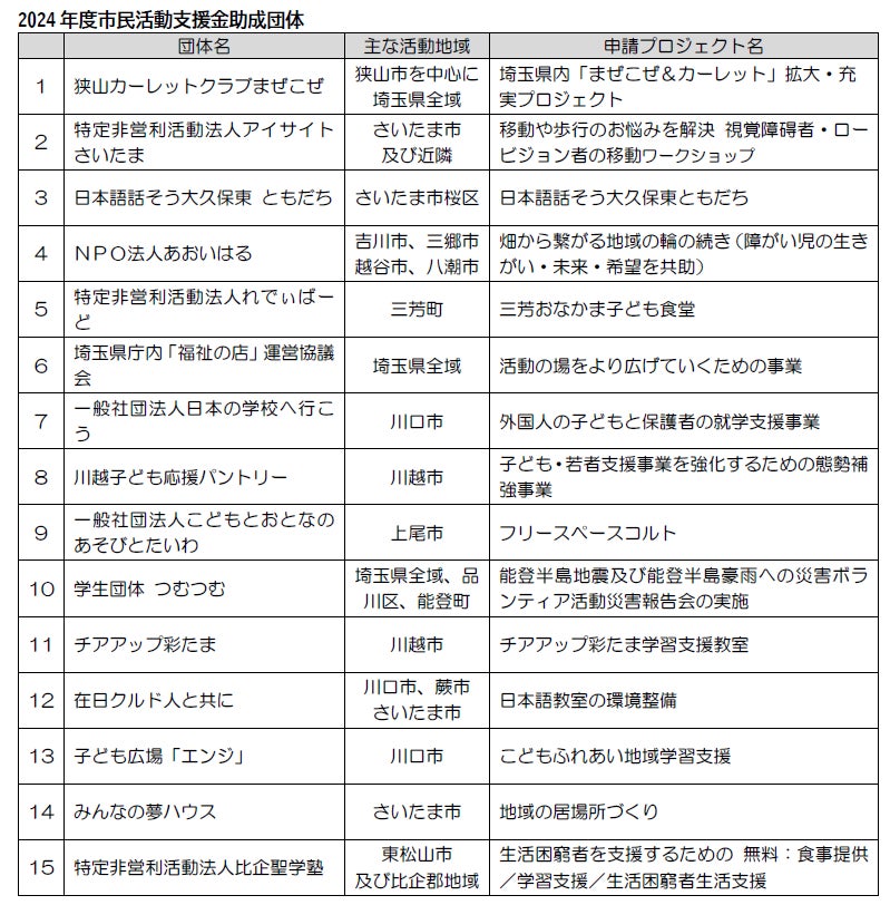 地域課題に向き合う15団体へ400万円 「市民活動支援金」贈呈式 3月24日(月)〔埼玉〕