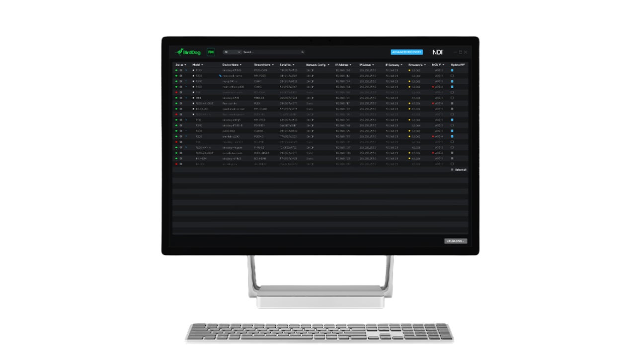 BirdDog Fleet Manager は、BirdDog 製品の管理、監視、更新作業を簡易化します。Fleet Manager 内にはすべての BirdDog デバイスが自動的に表示され、ステータスや IP アドレス、サブネット、デバイス名、ストリーム名、シリアル番号、ファームウェアバージョン、PTZ カメラの MCU バージョンなど、関連するすべてのデバイス情報をすぐに参照できます。