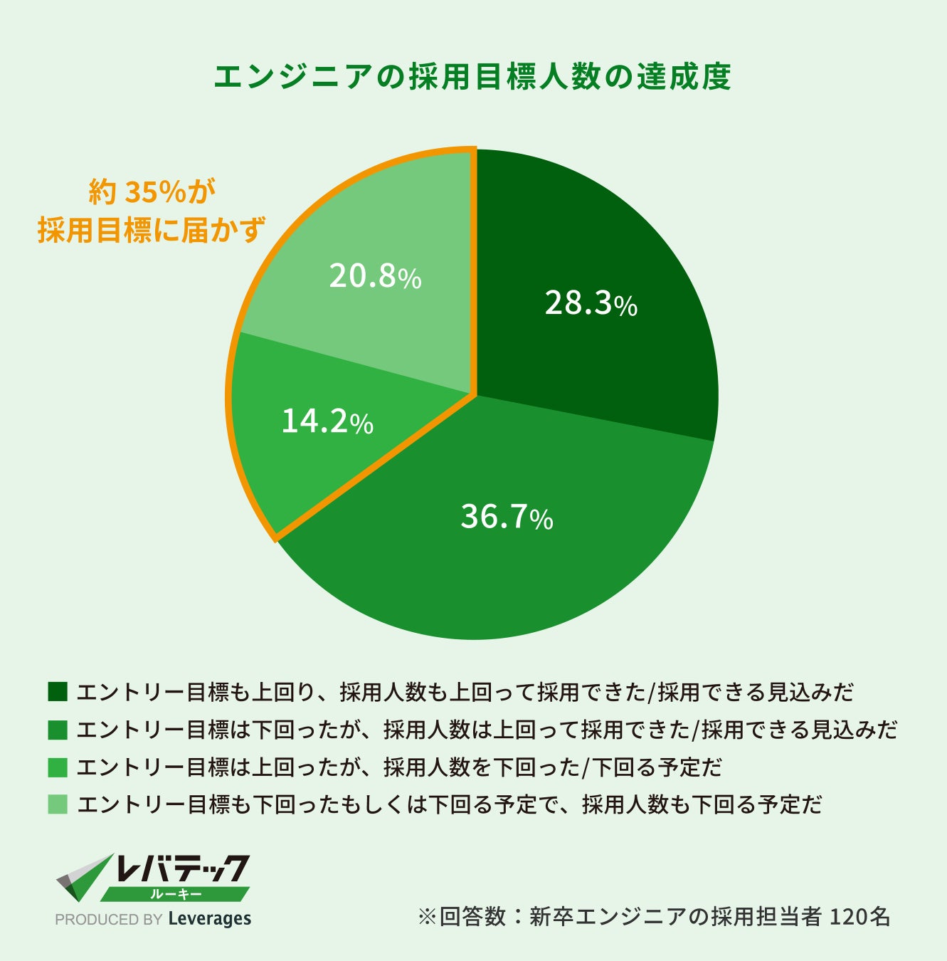 IT人材不足が叫ばれるなか、新卒エンジニア採用に力を入れる企業は少なくありません。レバテックの調査では、エンジニア採用において母集団拡大のために最も注力しているターゲットは「新卒採用(38.5%)」でした*1。しかし、新卒エンジニア採用を実施する企業の約35%が25卒の採用目標に達していない現状*2が明らかになっています。売り手市場が加速し、企業は新卒エンジニアの獲得に苦戦しています。