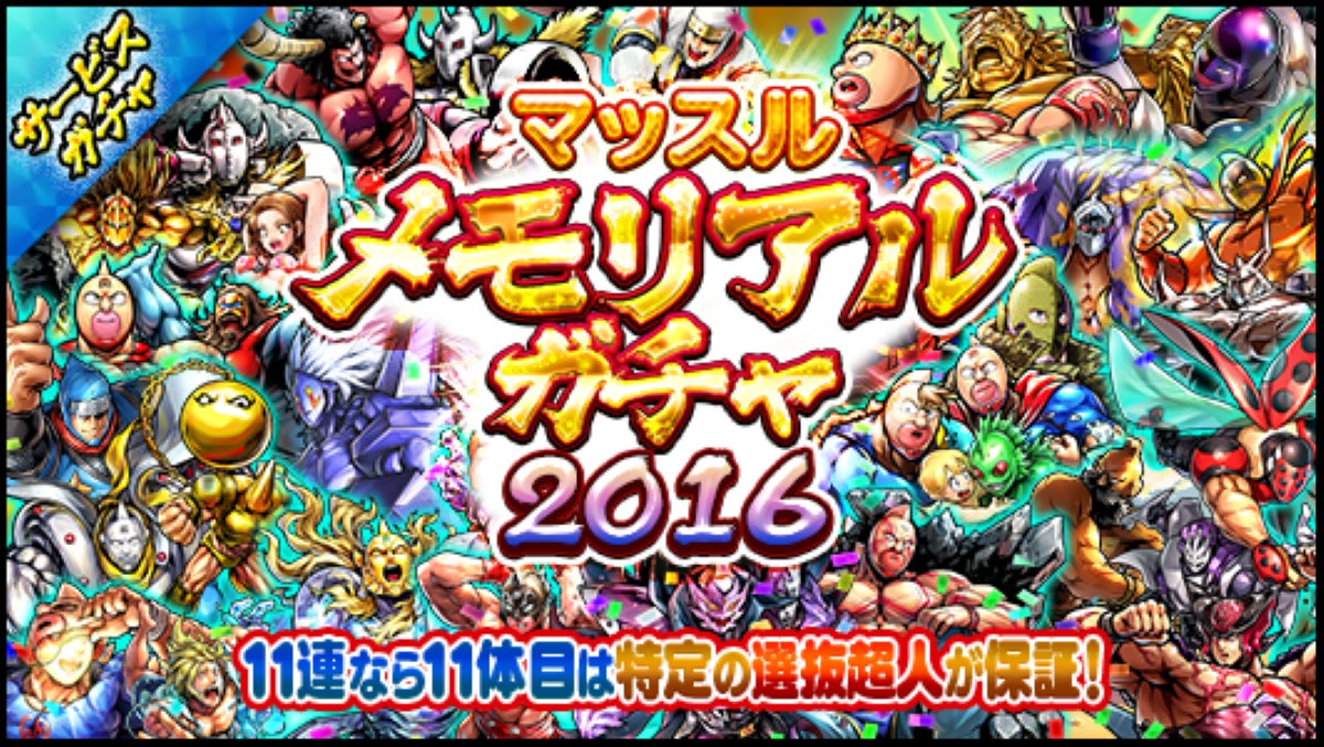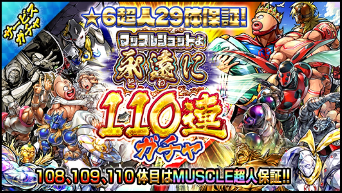 また、1つのステージをクリアするごとに、過去の超人を獲得できる「マッスルメモリアルガチャ」を引くことができます。例えば、2016年のステージで獲得した超人で2017年のステージに挑むなどして、当時の熱気のままバトルを楽しめます。また、★6超人が29体保証となる豪華な110連ガチャも引くこともできます。