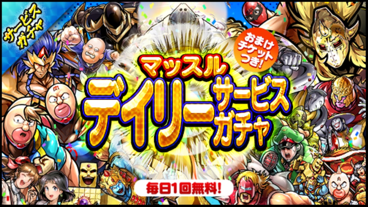 お一人様毎日1回のみ無料で引けるデイリーサービスガチャで、ガチャを引くことでおまけチケットを入手できます。おまけチケットを集めると、マッスルデイリーサービスガチャおまけチケット交換所で豪華報酬と交換することができます。