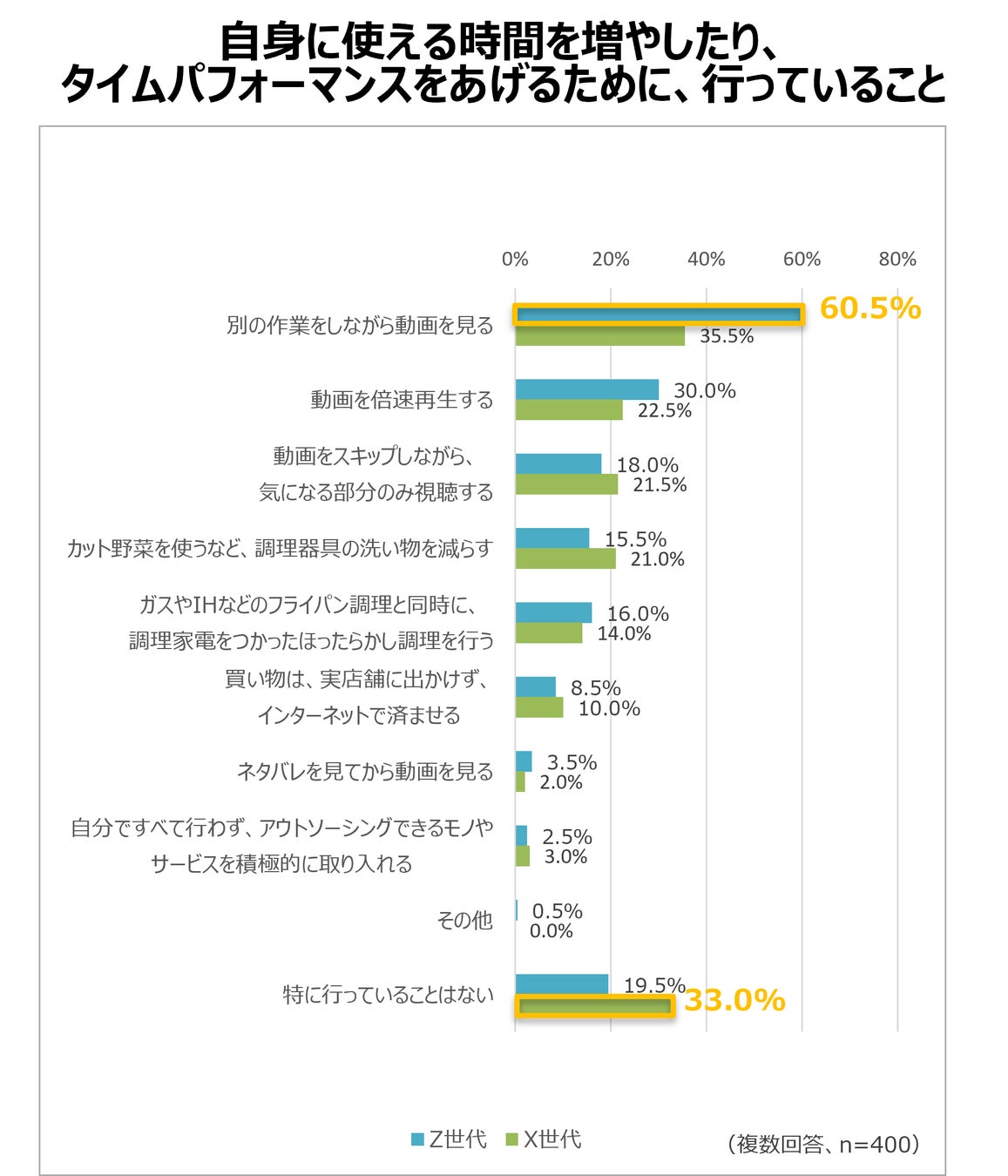 自身に使える時間を増やしたり、タイムパフォーマンスを上げるために行っていることとしては、Z世代では「別の作業をしながら動画を見る」が60.5%と過半数以上となりました。一方X世代では「特に行っていることはない」が33.0%と、明らかな世代間ギャップが見られました。