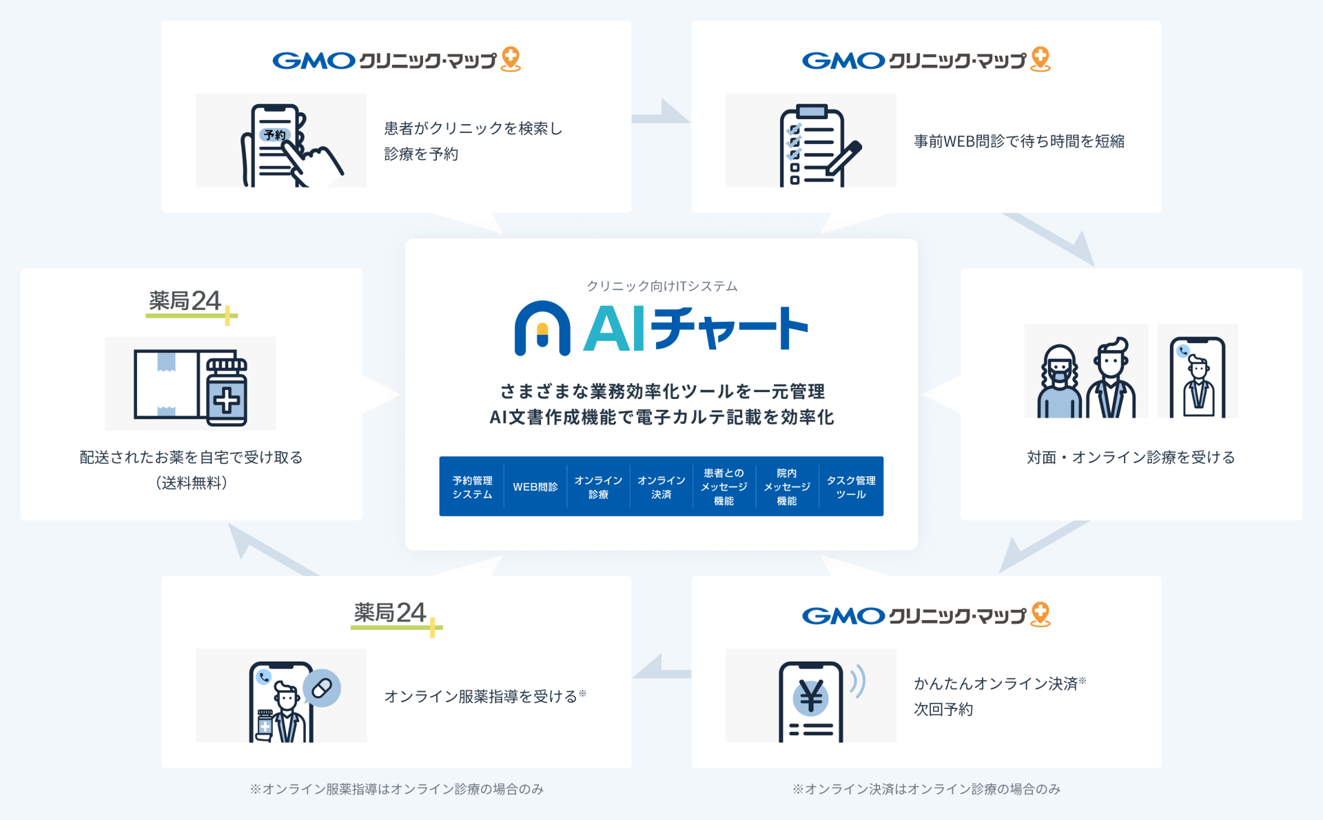 GMOヘルステックは、さまざまな業務の一元管理ができるAI搭載のクリニック向けシステム「AIチャート」を中心とし、クリニック検索・予約サイト「GMOクリニック・マップ」、そしてオンライン服薬指導にも対応する保険薬局「薬局24」の3️つのサービスを連携させ、クリニックと患者さまの両方に、無料でシームレスな診療体験(※2)を提供いたします。