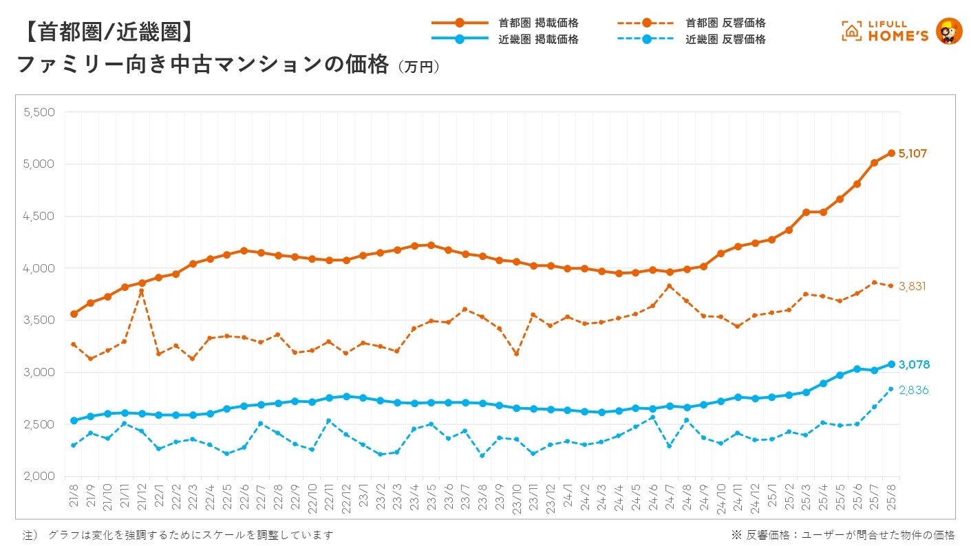 ファミリー向き中古マンションの平均掲載価格は、首都圏で5,107万円(前年同月比128.0%)、近畿圏で3,078万円(前年同月比115.6%)となり、首都圏、近畿圏ともに2021年2月の計測開始以降の過去最高価格を更新しました。