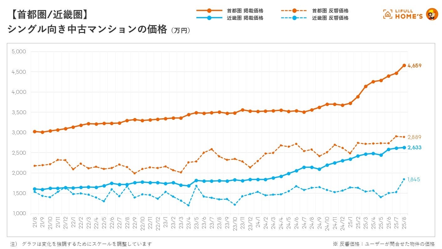シングル向き中古マンションの平均掲載価格は、首都圏(東京都、神奈川県、埼玉県、千葉県)で4,659万円(前年同月比130.8%)、近畿圏(大阪府、兵庫県、京都府)で2,633万円(前年同月比122.9%)となり、首都圏、近畿圏ともに2021年2月の計測開始以降の過去最高価格を更新しました。