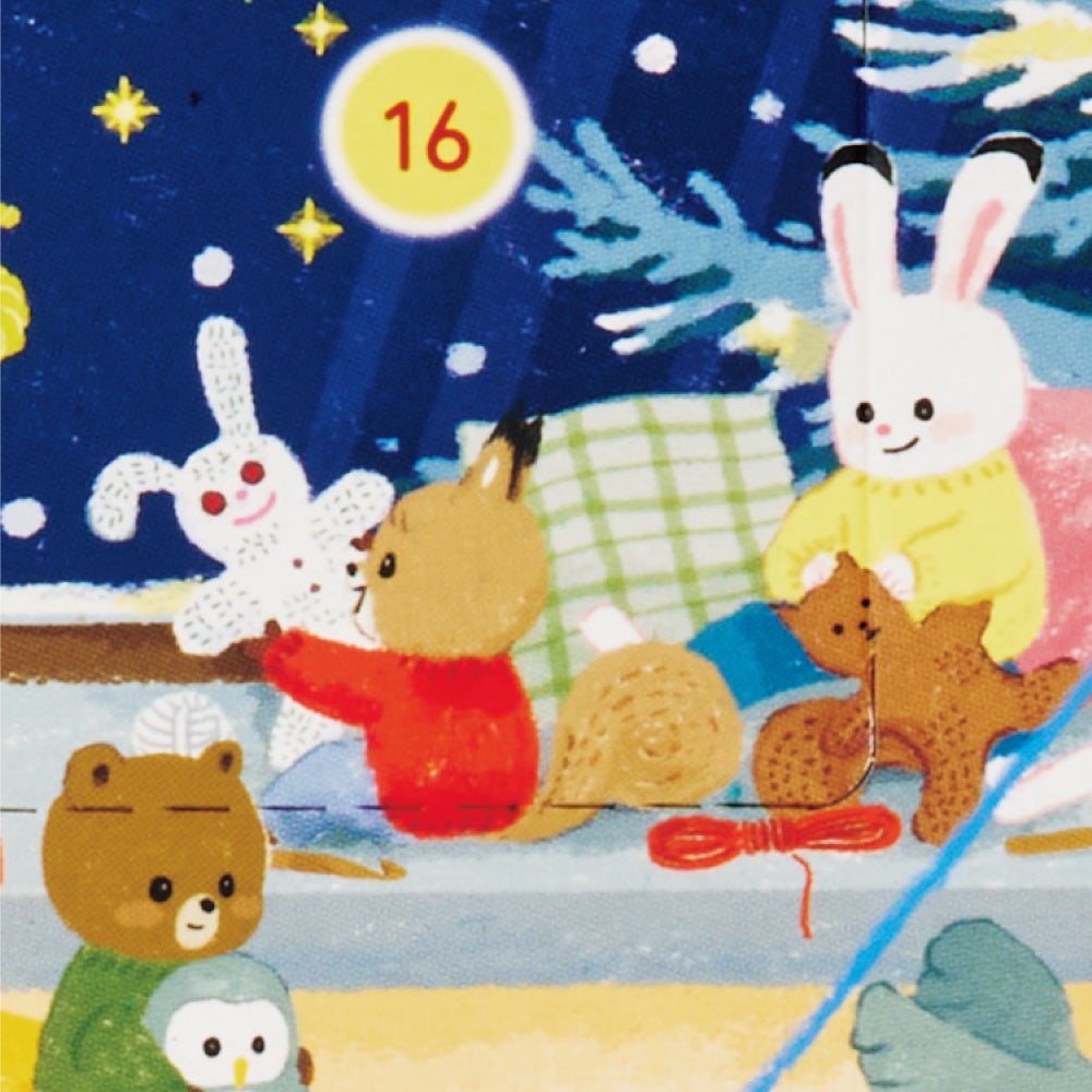 待ち遠しいクリスマス。小さな動物と妖精たちは、今年はサンタさんから何がもらえるかな?と首を長くしながら、みんなで協力してクリスマスプレゼントを入れる大きな靴下を編んでいます。 “よいしょっ” 高い足場やクレーンの上での作業もお手の物。ビーズやチャームを縫い付けてキラキラと飾って、さあ、完成までもう少し!フェルトでつくったクリスマスツリーもいよいよ最後の仕上げ。あとは “サンタさんへ” 願いを込めてお手紙を書いて…。早くクリスマスになあれ!
