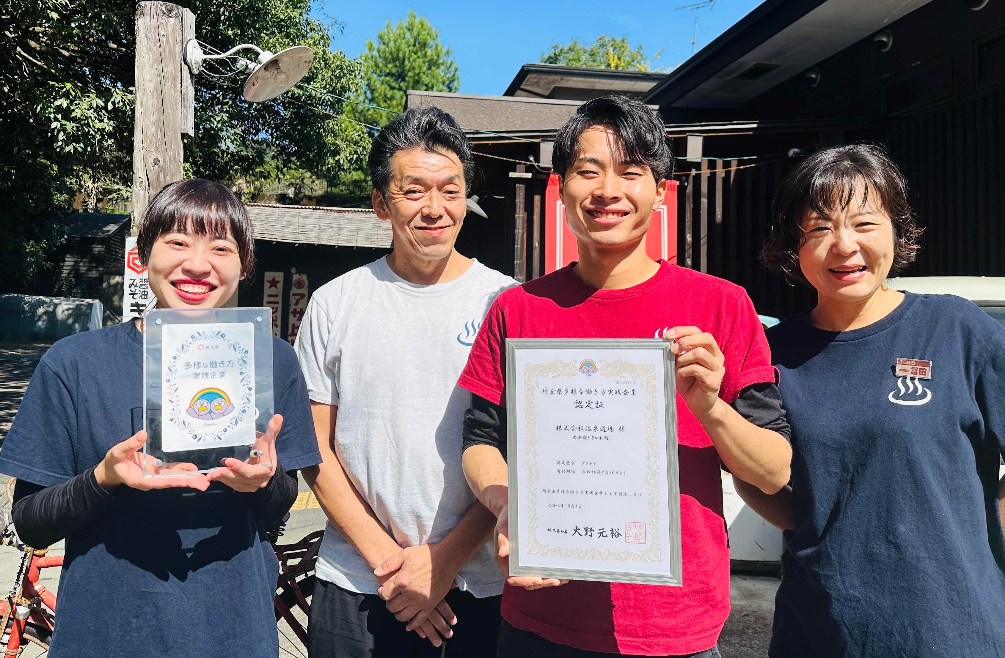 温泉道場が埼玉県の「多様な働き方実践企業認定制度」で、最高位「プラチナ認定」を取得しました