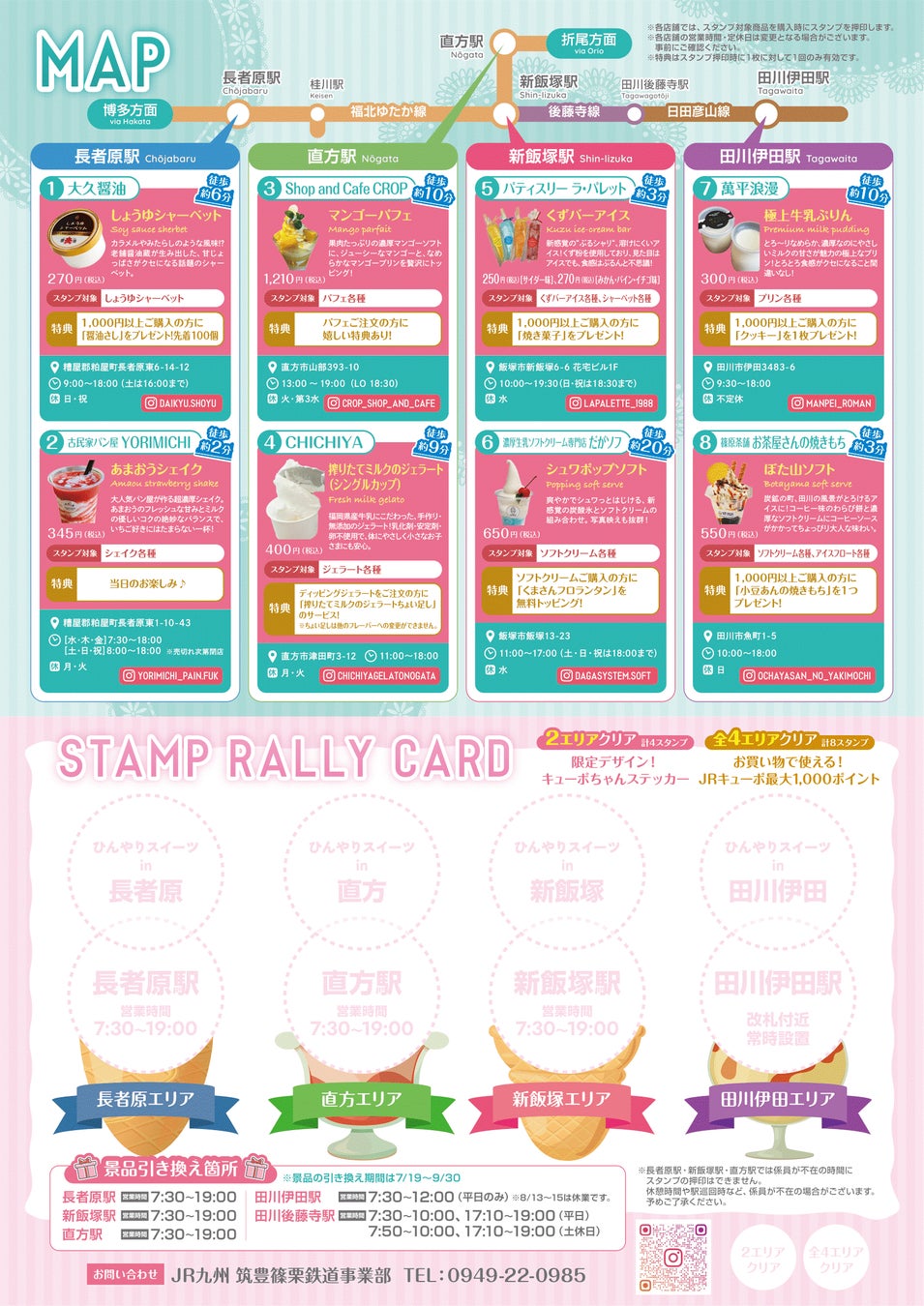シュガーロード・炭鉱によりスイーツ文化が栄えるまちの『ひんやりスイーツ』を列車に乗ってめぐるスタンプラリーです。 期間中、4つの対象駅(長者原駅・新飯塚駅・直方駅・田川伊田駅)と各駅最寄りの2つの協力店舗に計12個の専用スタンプを設置します。 チラシ兼スタンプシートに店舗のスタンプと最寄り駅のスタンプを集めていただきます。