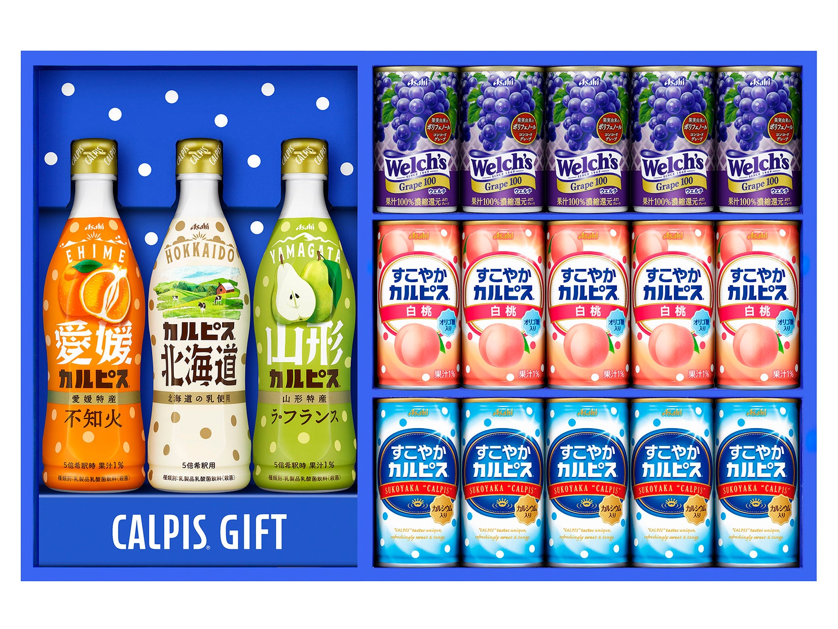 「すこやかカルピス」と「Welch’s」に加え、『カルピス 北海道』『カルピス 愛媛特産不知火』『カルピス 山形特産ラ・フランス』を詰め合わせたバラエティ豊かなギフトセットです。