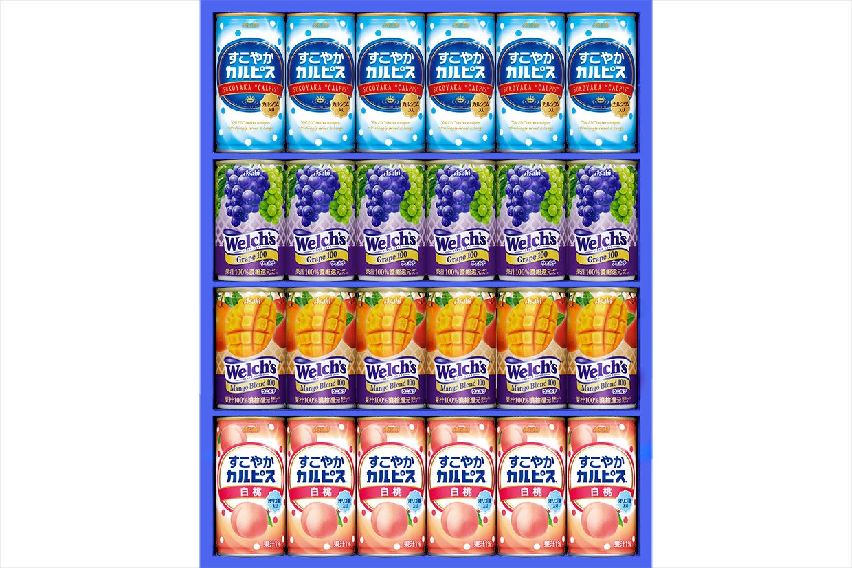 すこやか素材を加えた、そのままお飲みいただけるタイプの「すこやかカルピス」と、おいしさと品質にこだわり続けている、濃厚で上質な味わいが魅力の「Welch’s」100%果汁ジュースを詰め合わせたバラエティ豊かなギフトセットです。